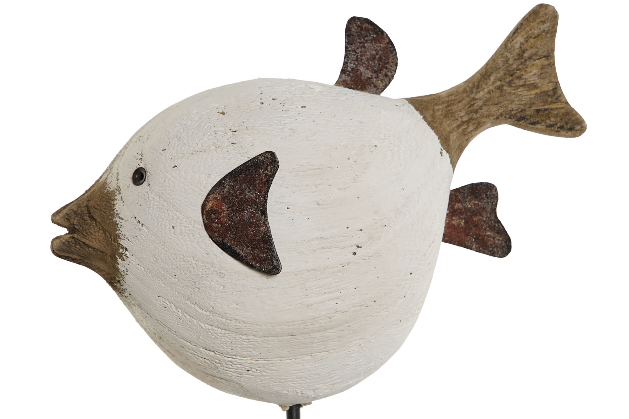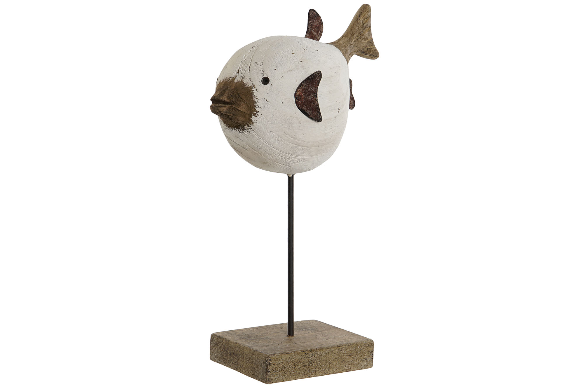 Figura de pez globo en peana, material: paulownia y metal.