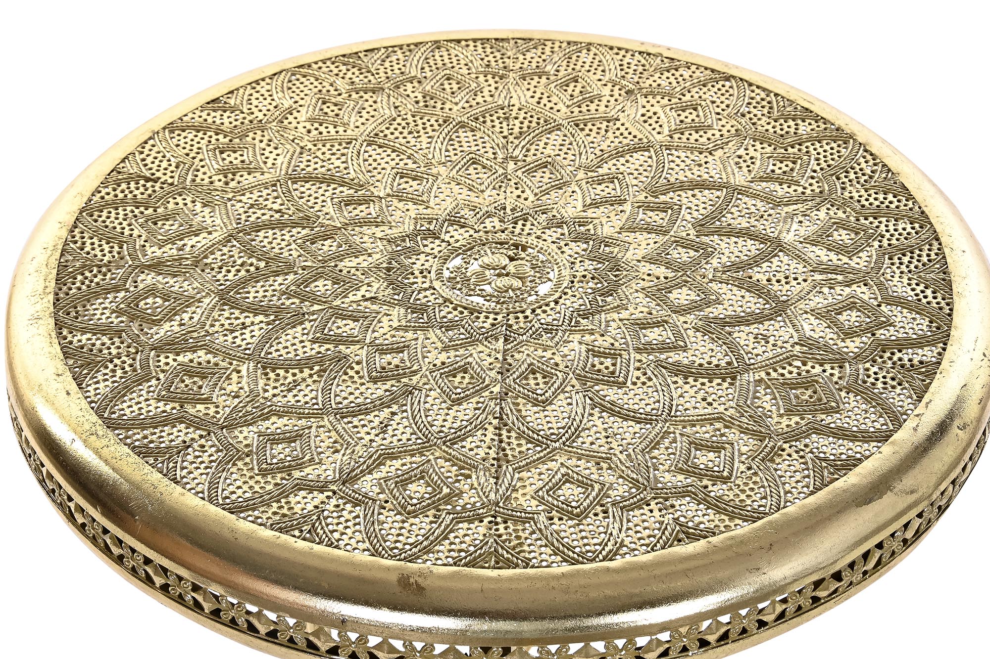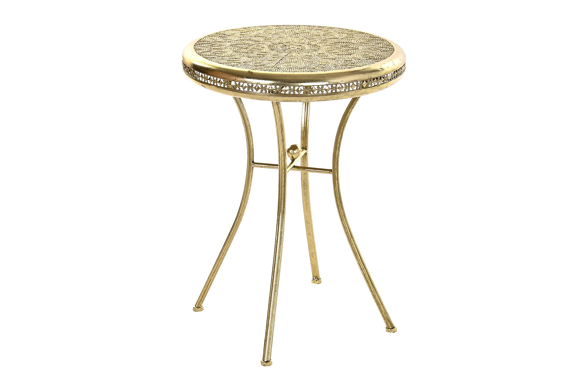 Mesita auxiliar de metal, color dorado envejecido.